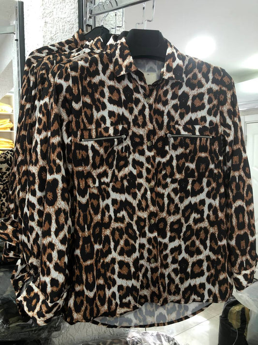 Long Sleeve Leopard Button Up Zipper Pockets Shirts Blouses