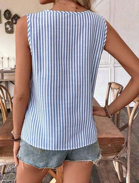 Blue Stripe Cut Out Square Neck Sleeveless Tank Tops Tunics Blouse