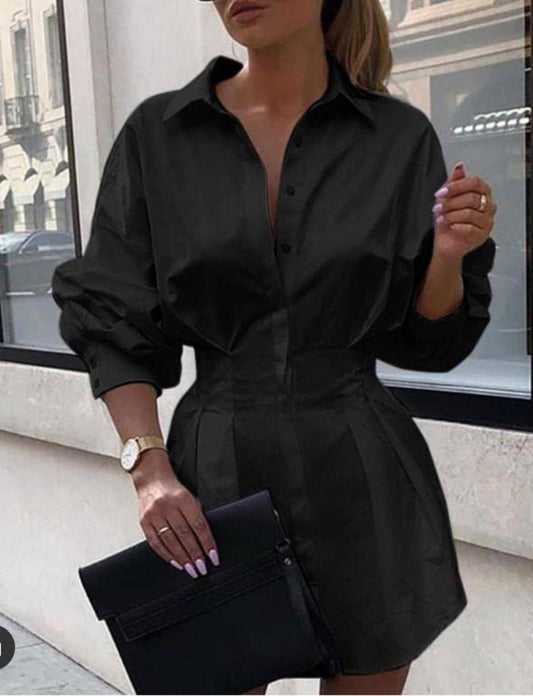Button-Up Shirt Pleated Waist Mini Women Dress