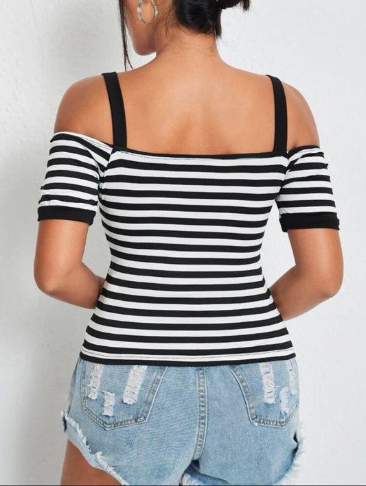 Cold Shoulder Striped Tee Top Short Sleeve Shirt Embellished Off Shoulder Blouse