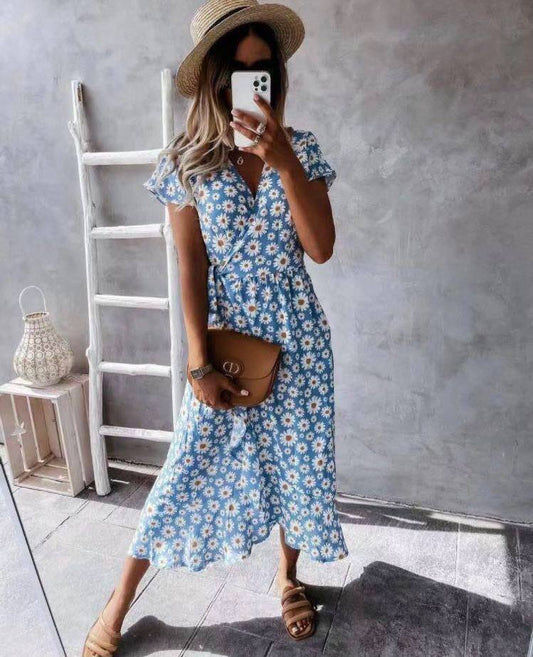 Printed Full Length Belted V Neck Dress