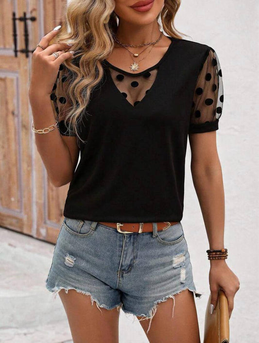 POLKA DOT MESH PATCHWORK SHORT PUFF SLEEVE T-SHIRT
