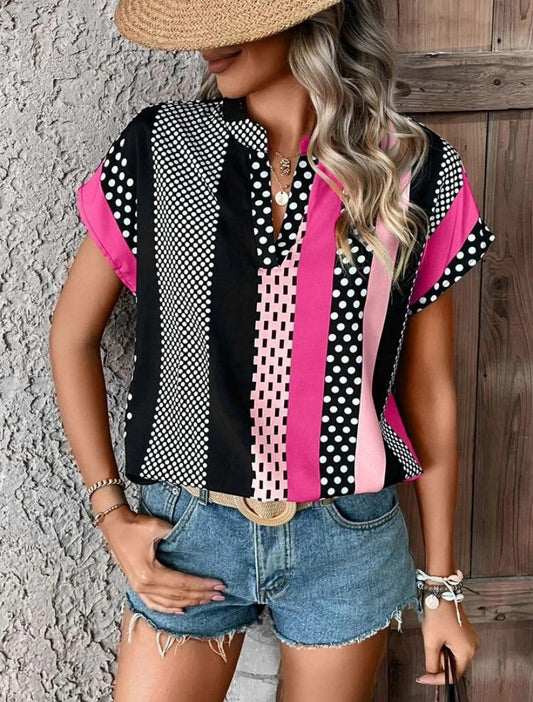 POLKA DOT STRIPE V NECK BATWING SHORT SLEEVE TOPS BLOUSE