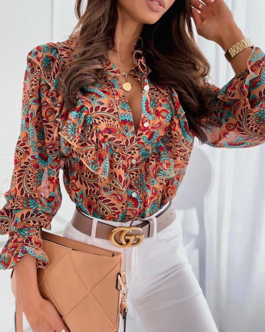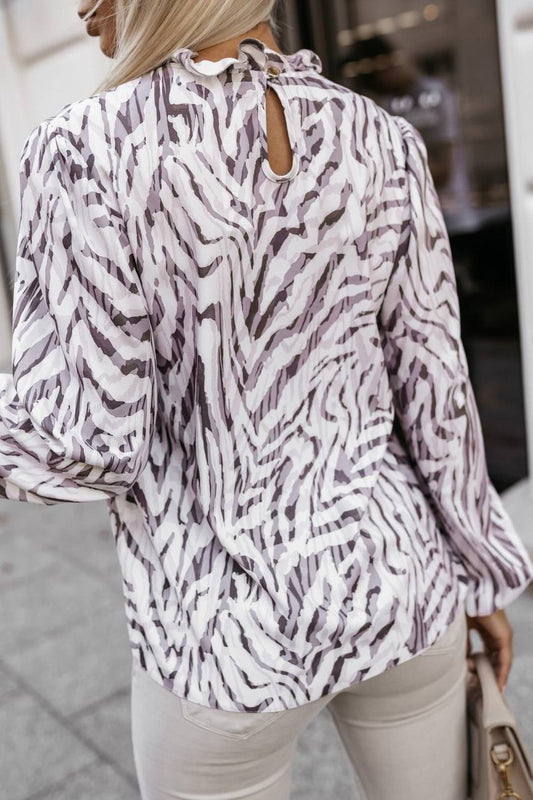 Mock Neck Ruffled Long Sleeve Back Keyhole Blouse