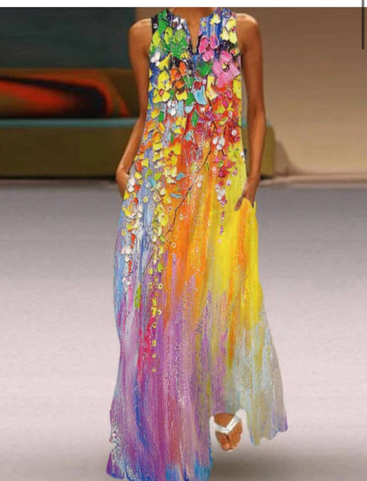 Floral Print Notched Neck Long Dress Casual Sleeveless Maxi Dress