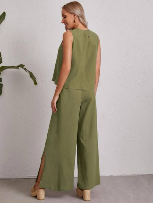 Green Color Pants Set, Crew Neck Sleeveless Top Side Slit Loose Pants Outfits