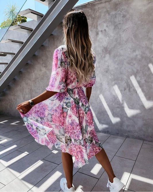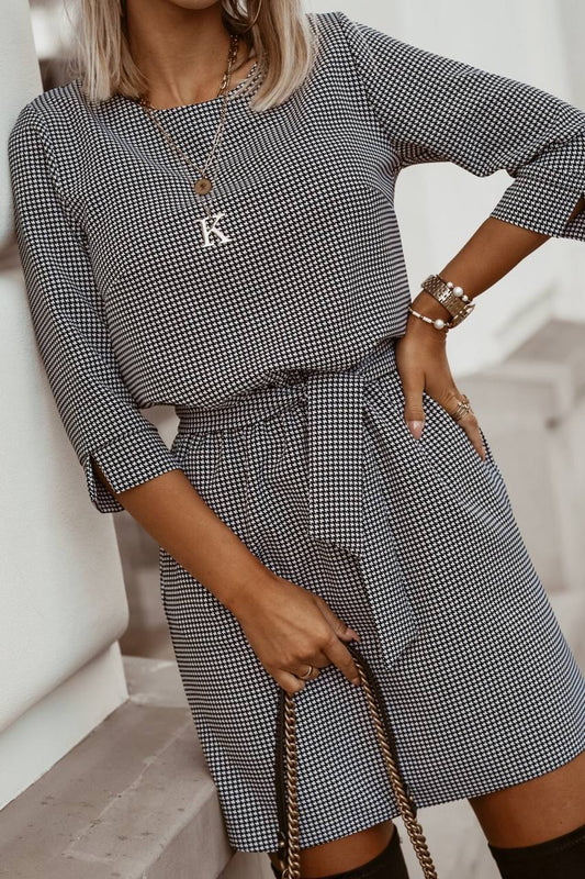 HOUNDSTOOTH CASUAL DRESS WITH BELTED HALF SLEEVE