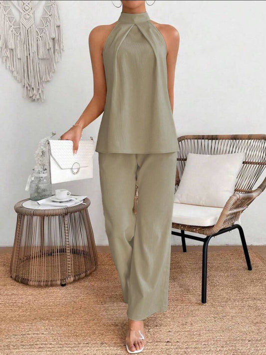 2 Pieces Set Keyhole Back Top and Wide Leg Pants Set