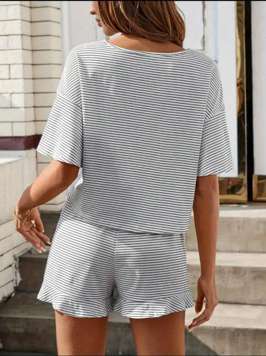 2 Piece Outfits Striped Print Lounge Sets Short Sleeve Top and Shorts Matching Set